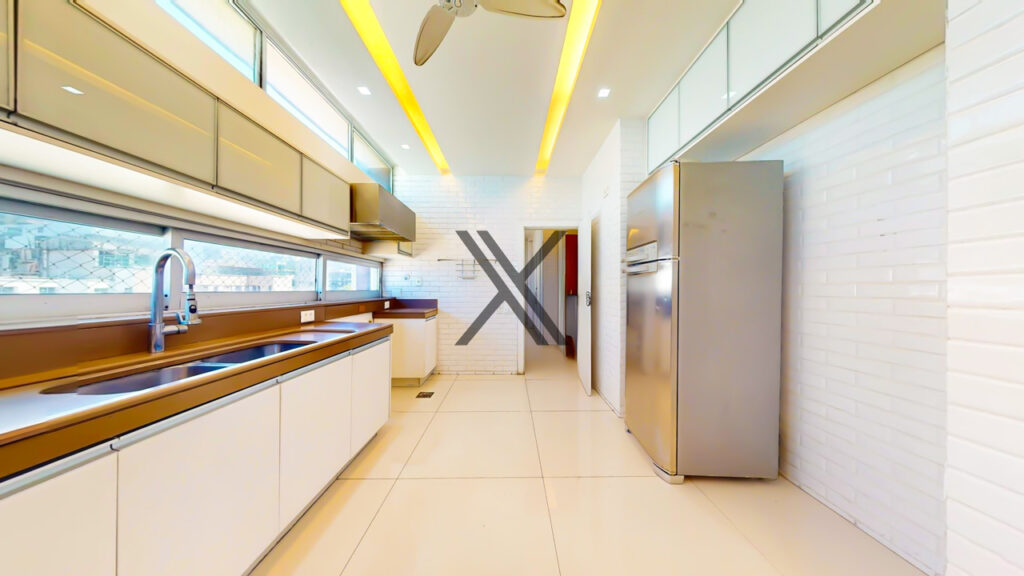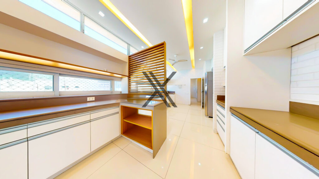 A cozinha conta com vasta área de armazenagem e bancadas, além de espaço para eletrodomésticos de ponta. Em anexo está a área de serviço/ lavanderia com uma dependência completa para funcionários.