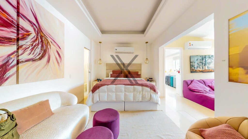 No acesso à parte privativa, temos uma sala íntima, utilizada como sala de TV. Ao todo, temos 3 quartos, sendo 1 suíte, todos com bom tamanho, armários e splits instalados, além de um banheiro social.