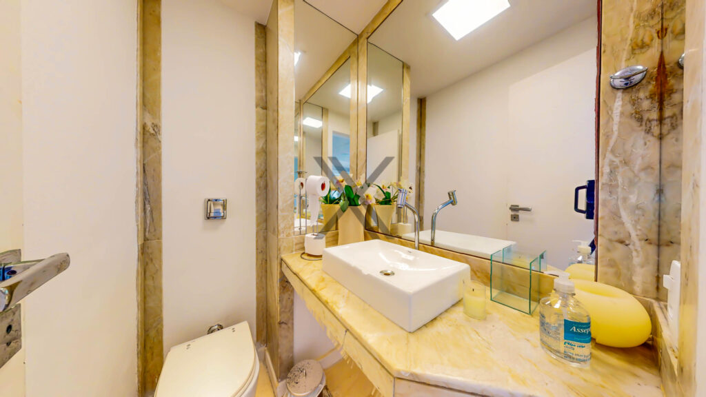 No primeiro pavimento temos a área social do imóvel, com uma excelente sala dividida em 2 amplos e confortáveis ambientes, varanda com vista para o mar, além de projeto luminotécnico e climatização. Um lavabo de apoio complementa o ambiente.